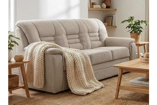 Priestranný trojsedák v elegantnom štýle má vysoké a komfortne tvarované operadlo, ktoré poskytuje kvalitnú oporu pri sedení. Trojmiestna pohovka je očalúnená štruktúrovanou látkou vo farbe béžová a doplnená výrazným prešivom. Výhodou tejto pohovky je praktická funkcia s rozkladom na lôžko, ktorú oceníte nielen vy, ale aj napríklad vaša návšteva. Navyše oceníte aj veľmi solídne spracovanie.