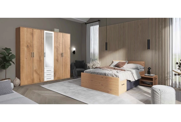 Do šatníkovej skrine o šírke 225 cm ľahko uložíte aj početné ošatenie. Táto šatníková skriňa je vyrobená v kombinácii doskový dub/biela a hodí sa ako do moderného, tak i do klasicky zariadeného interiéru. Navyše oceníte zrkadlo na stredových dverách aj praktické zásuvky na ukladanie napríklad drobnej bielizne alebo doplnkov.