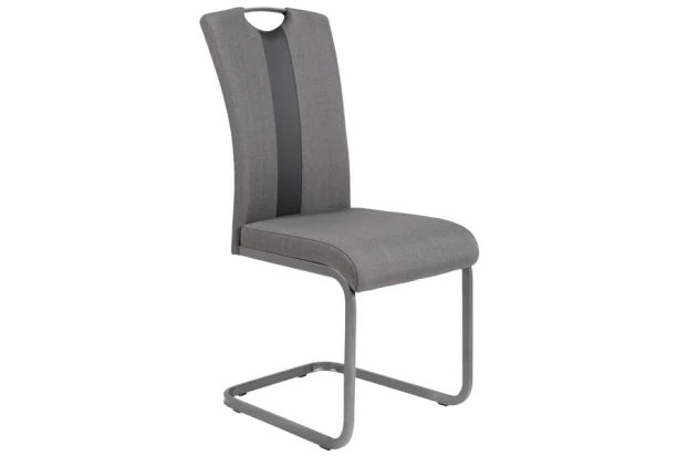 Moderná jedálenská stolička na stabilnej kovovej podnoži je doplnená horným madlom pre ľahšiu manipuláciu pri odsúvanie od stola. Sedacia časť očalúnená kombináciou šedej látky a antracitovej ekokože.