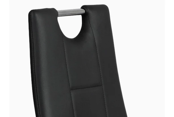 Jedálenská stolička s kovovou chrómovanou konštrukciou a praktickým madlom. Operadlo potiahnuté čiernou ekokožou s dekoratívnym prešitím uprostred.