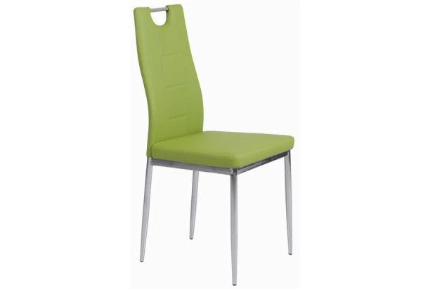 Jedálenská stolička s kovovou chrómovanou konštrukciou a praktickým madlom. Operadlo potiahnuté zelenou ekokožou s dekoratívnym prešitím uprostred.