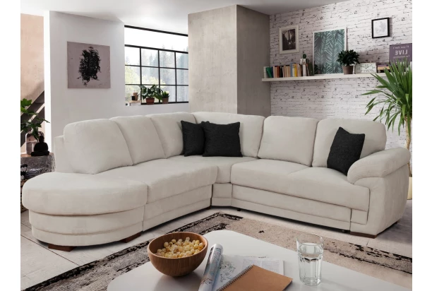 Moderná sedacia súprava má elegantný dizajn a nadchne vás príjemne mäkkým komfortom, optikou nadýchaných tvarov a priestranností. Očalúnená štruktúrovanou žinilkovou látkou v odtieni svetlo šedá. Rohová sedačka so zaobleným otomanom tvorí ľavý roh a oceníte jej kvalitné spracovanie. Pohodlie sedačky dopĺňajú navyše tri vankúšiky. Súčasťou tejto sedačky je aj funkcia rozkladu pre príležitostné spanie aj úložná zásuvka na kolieskach, ktorú ľahko vysuniete.