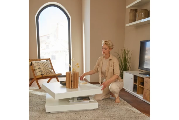 Dizajnový stolík zaujme svojou otočnou konštrukciou – ľahko tak získate praktický aj nápaditý nábytok, ktorý sa hodí do každého moderného interiéru. Vyrobený v bielej farbe.