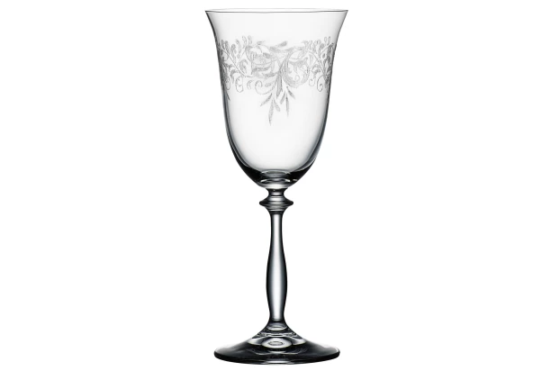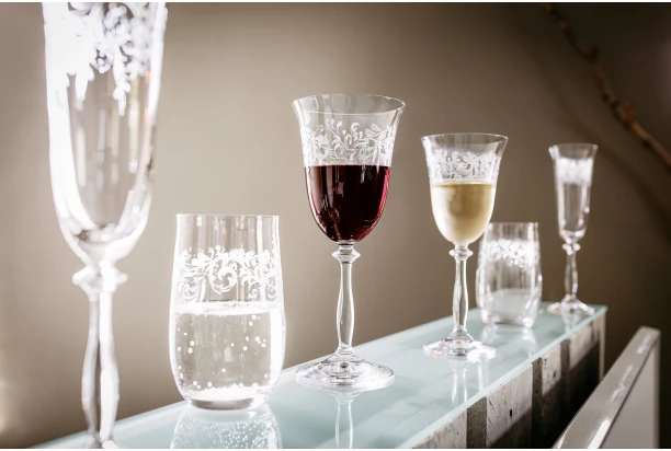 Pohár na červené víno s objemom 350 ml zo série Romance s gravírovanými ornamentami, vytvára jedinečnú romantickú atmosféru.