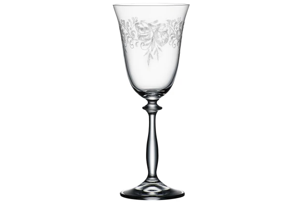 Pohár na biele víno s objemom 250 ml zo série Romance s gravírovanými ornamentami, vytvára jedinečnú romantickú atmosféru.