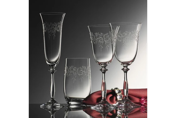 Pohár na vodu s objemom 380 ml zo série Romance s gravírovanými ornamentami, ktoré vytvárajú jedinečný dekoratívny prvok. Skvele zapadne do Vašej domácnosti na príležitostné alebo aj každodenné využitie.