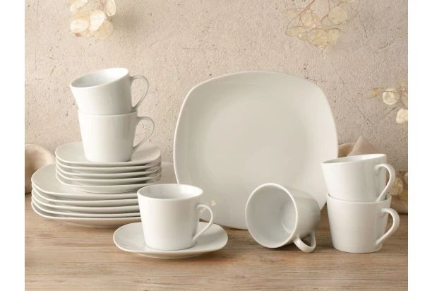 18-dielny kávový servis z kolekcie Amelie v univerzálnej bielej farbe je vyrobený z kvalitného porcelánu. Hranatý tvar so zaoblenými rohmi, vrátane kužeľovitého hrnčeka, je veľmi elegantný a prináša moderný vzhľad ku každému stolu. Táto kávová sada je určená pre tých, ktorí ocenia kombináciu elegantného dizajnu a praktickosti pri servírovaní kávy a dezertov.