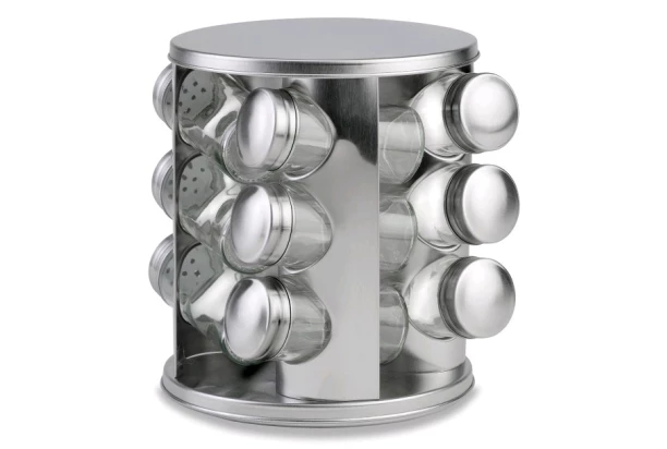 Táto 13-dielna súprava obsahuje 12 prázdnych sklenených koreničiek so skrutkovacími uzávermi a navyše otočný nerezový stojan. S týmto stojanom uschováte až 12 rôznych druhov korenia, ktoré budete mať vždy pri ruke.