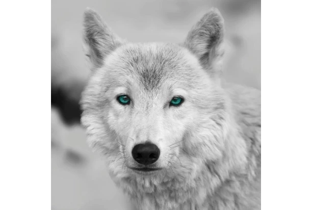 Štvorcový obraz na stenu s motívom arktického vlka s výraznými tyrkysovými očami perfektne doladí atmosféru interiéru. Čiernobiely obraz o rozmeroch 35×35 cm.