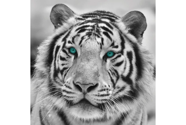 Štvorcový obraz na stenu s motívom tigra s výraznými tyrkysovými očami perfektne doladí atmosféru interiéru. Čiernobiely obraz o rozmeroch 35×35 cm