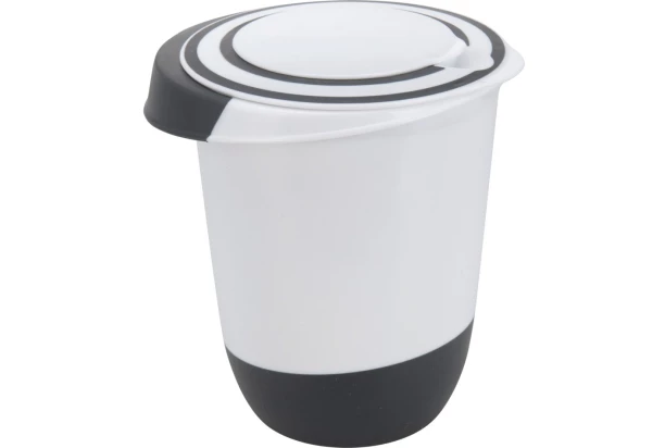 Praktická a všestranná misa na šľahanie s vekom a výlevkou je perfektným pomocníkom do každej kuchyne, hlavne počas pečenia. Skvele sa hodí na šľahanie cesta, krémov, nátierok, šľahačiek, snehu. Vďaka praktickému dvojdielnemu viečku je používanie oveľa pohodlnejšie ako s bežnými nádobami. Pri šľahaní môžete odklopiť iba stredovú časť viečka, čo vytvorí priestor pre šľahacie metly, zatiaľ čo okraje viečka zostanú nasadené a ochránia kuchyňu pred rozstrekovaním. Po uzavretí stredovej časti viečka zabránite vysychaniu ušľahaných pokrmov. Čierno-biela šľahacia misa je vyrobená z kvalitného plastu a má objem 1,5 l, priemer 13 cm a výšku 16 cm.
