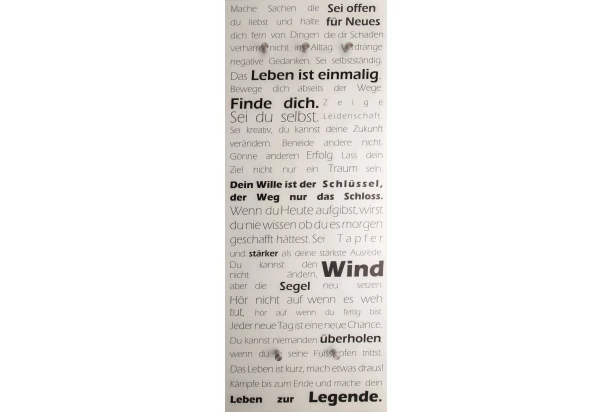 Dekoratívny vešiakový panel s nemeckým textom, dokonalo doplní štýlovo zariadený priestor predsiene. Na horné háčiky možno zavesiť odevy, ako sú kabáty alebo bundy. Háčiky v spodnej časti sú vhodné pre zavesenie tašiek.