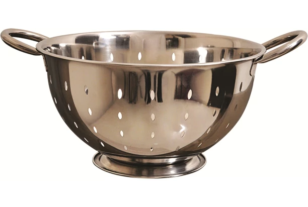 Nerezové cedidlo s priemerom 25 cm má praktické madlá po stranách a stabilný podstavec.