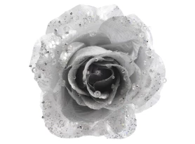 Elegantný kvet bielej ruže s trblietkami je perfektnou dekoráciou do izby alebo ozdobou na stromček či adventný veniec. Je možné ju tiež použiť ako dekoratívny predmet na svadbe. Vďaka klipu môžete ružu ľahko pripevniť kamkoľvek chcete.