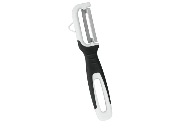 Kuchynská škrabka v čierno-sivom prevedení je vybavená čepeľou z nerezovej ocele, ktorá perfektne olúpe zeleninu alebo zemiaky. Malá kuchynská pomôcka s protišmykovou rukoväťou z termoplastu veľmi dobre padne do ruky a prsty sa nešmýkajú pri práci.