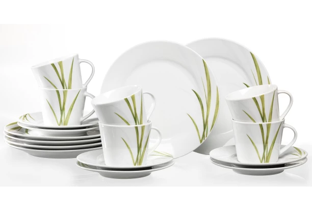 18-dielny kávový servis s jednoduchým prírodným motívom trávy pôsobí harmonicky a zaujme pozornosť na jedálenskom stole. Riad je vyrobený z vysoko kvalitného porcelánu a dokonale zapadne do každej kuchyne. Prestrite stôl a servírujte až pre 6 osôb.