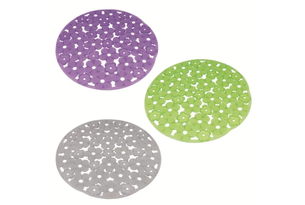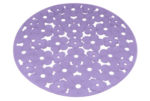 Protišmyková štýlová podložka z farebného transparentného plastu ochráni drez a kuchynský riad pred poškodením počas umývania. Podložka zachytí nečistoty a zvyšky potravín, a preto nedôjde k upchatiu. Podložka s priemerom 30 cm s motívom kvetín navyše môže plniť aj ozdobnú funkciu.