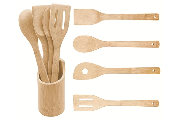 Sada kuchynských pomôcok v stojane obsahuje 5 dielov (4 kuchynské pomôcky a 1 praktický stojan). Všetko je vyrobené z kvalitného bambusového dreva.