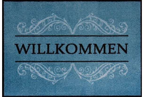 Moderná rohožka so štýlovým nápisom Willkomen na modrom podklade skvele vynikne pred vchodovými dverami, kde vrelo uvíta každého hosťa. Rozmer 39×58 cm.