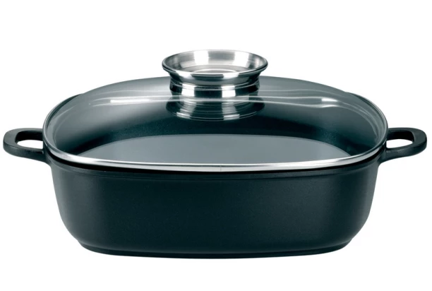 Kvalitný pekáč s poklopom je vyrobený z robustného hliníka s kvalitným nepriľnavým povrchom, čo zaistí niekoľkonásobne rýchlejšiu absorpciu tepla, dlhodobé udržanie teploty a ľahkú údržbu. Žiaruvzdorný sklenený poklop vybavený aróma otvorom pre možnosť prísunu korenia a aromatických olejov, ktoré pokrm počas pečenia skvele prevonia. Ako bonus navyše dostanete 2 kusy ochranných termo-chňapiek zdarma.