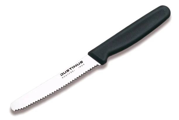 Kuchynský nerezový nôž so silným vlnitým ostrím je určený pre ľahké krájanie chleba a ďalšieho pečiva. Má oceľovú čepeľ dlhú 11 cm a plastovú rukoväť.