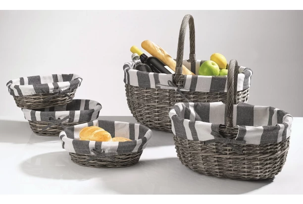 Praktický košík z prírodného prútia potiahnutý látkou s šedo-bielymi pruhmi nájde svoje uplatnenie v každej domácnosti. Kôš plný čerstvého ovocia alebo pečiva dodá kuchyni útulný nádych. Rozmer 29×9×20 cm.