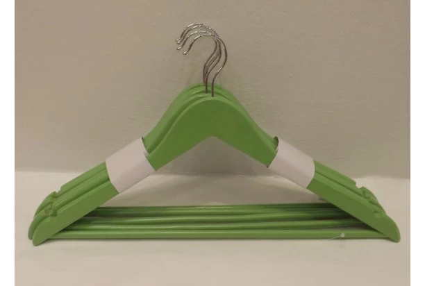 Sada 5 kusov klasických vešiakov na oblečenie. Drevená konštrukcia v zelenej farbe.
