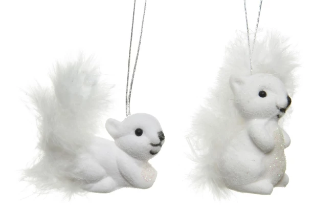 Táto sada dvoch vianočných dekorácií v tvare veveričky je vyrobená z bieleho mäkkého zamatového plastu. Jedna veverička je stojaca a druhá ležiaca. Obe veveričky majú chvost z peria. Figúrky je možné zavesiť ako ozdoby na vianočný stromček, ale je možné ich tiež použiť ako vianočnú dekoráciu na ozdobenie adventných vencov alebo iných predmetov.
