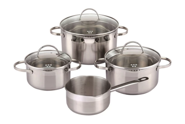 Vysoko komfortná sada riadu na varenie obsahuje celkom 7 dielov z kvalitnej nehrdzavejúcej ocele a skla. Oceníte vnútorné stupnice objemu v litroch a inovatívne riešenú pokrievku, ktorá slúži ako praktické cedidlo, výlevka vody aj ventil pre odvod pary. Tieto praktické vychytávky vám uľahčia a urýchlia varenie.