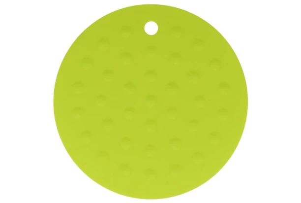 Silikónová guľatá podložka v limetkovo zelenej farbe pod riad, najmä pod horúce hrnce a panvice, dokonale ochráni povrch stolov alebo pracovnej plochy. Možno ju použiť aj ako chňapku pre bezpečné uchopenie horúceho riadu alebo pri otváraní fliaš. Priemer 17 cm.
