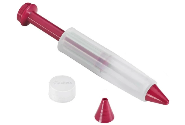 Cukrárske zdobiace pero s dĺžkou 17 cm vám pomôže vykúzliť jedinečné ozdobné tvary na cukrovinky, perníčky, torty a ďalšie dezerty. Súčasťou balenia sú 2 rôzne trysky.