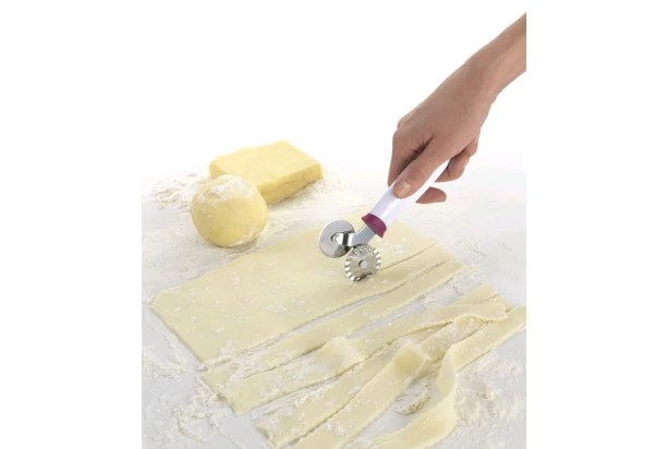 Zdvojené rádýlko na těsto s vroubkovaným a hladkým kolečkem. Hladké kolečko slouží ke snadnému rovnému prokrojení těsta na vále. Pomocí vroubkovaného kolečka nakrájíte hotový tenký moučník nebo pizzu. Nerezová kolečka v kombinaci s plastovou rukojetí, ve které je praktické očko pro zavěšení na kuchyňskou lištu. Snadná údržba.