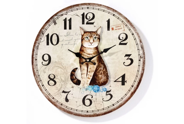Nástenné hodiny s priemerom 33 cm majú ciferník s motívom mačky vo vintage štýle. Hodiny skvele doplnia akúkoľvek izbu.