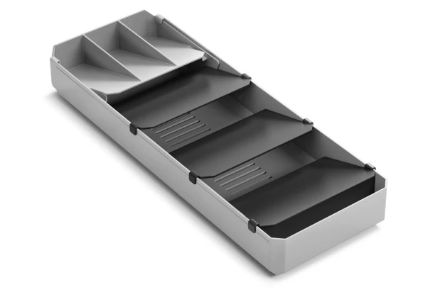 Nastaviteľný zásuvkový organizér na príbory pojme až 90 kusov príborov. Šedý príborník je možné prispôsobiť Vašej zásuvke, pretože sa dá vytiahnuť a nastaviť v rozmedzí 40 – 49 cm a nechýbajú ani variabilné priehradky.