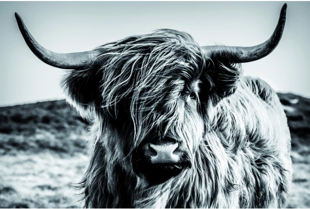Obraz tlačený na plátne o rozmere 90×60 cm sa stane dominantným prvkom akéhokoľvek interiéru. Motív škótskej horskej kravy s dlhou, huňatou srsťou a silnými rohmi v monochromatickej čierno-bielej farbe vnesie do vášho domova pokoj a majestátnu silu prírody.