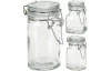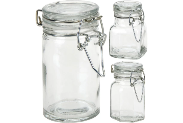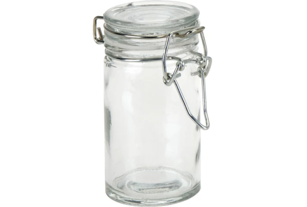 Sklenená dóza na potraviny s kovovou sponou a silikónovým krúžkom je dodávaná v 3 rôznych tvaroch. Malá skladovacia nádoba, má objem 60 ml a stane sa praktickým kuchynským doplnkom.