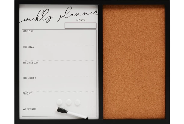 Praktická magnetická tabuľa s týždenným plnánovačom bude nielen zaujímavou dekoráciou. Súčasťou je aj korková tabuľa, na ktorú môžete pripichnúť fotografie či poznámky.