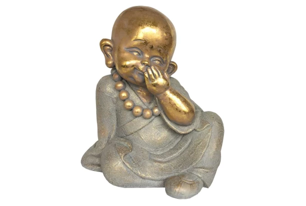Veľká socha v podobe detského Budhu s gestom nehovorím zlo v zlatej farbe stane sa dominantou Vašej domácnosti. Štýlová a originálna dekorácia, ktorá v miestnosti navodí príjemnú atmosféru a pokojnú náladu. Socha je vysoká 45,5 cm.