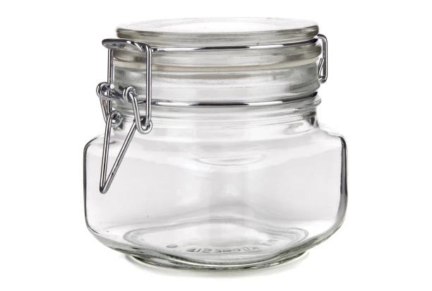 Elegantná sklenená hermetická dóza na potraviny s kovovým zatváracím patentom a skleneným viečkom osadené klasickým gumovým tesnením má objem 0,5 litra. Nádoba je veľmi vhodná na zaváranie drobného ovocia alebo uskladnenie suchých potravín, ako je napr. čaj, káva, oriešky, cestoviny, strukoviny atď. Drôtený systém uzáveru nie je nerezový, a preto nie je pohár vhodný do umývačky.
