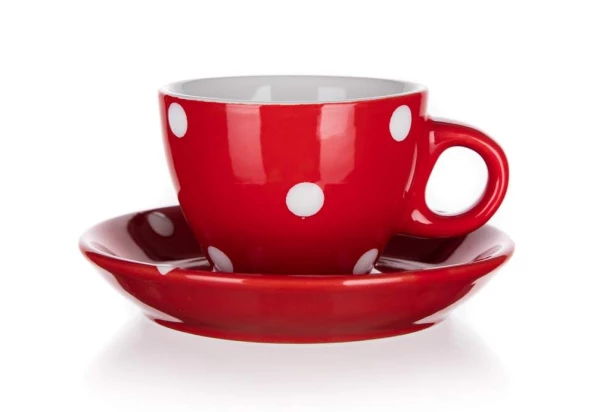 Keramická šálka 100 ml s tanierikom v červenej farbe s bielymi bodkami pre Vašu obľúbenú kávu.