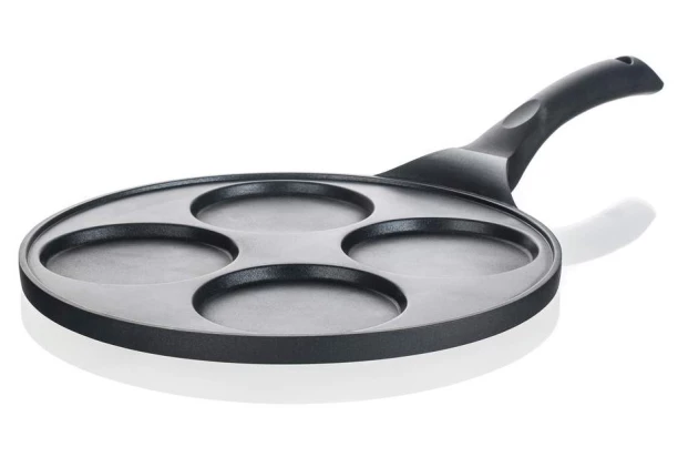 Hliníková liata čierna panvica na 4 lievance s vnútorným nepriľnavým povrchom Whitford Xylan je vhodná na všetky typy sporákov vrátane indukcie. Lievančiek s priemerom 26 cm je možné používať na prípravu lievancov, volských ôk a zemiakov.