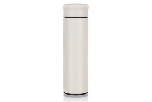 Cestovná múdra termoska s objemom 420 ml v béžovej farbe má vonkajší aj vnútorný povrch z kvalitnej nerezovej ocele a plastové viečko, v ktorom je zabudovaný digitálny dotykový teplomer na sledovanie aktuálnej teploty nápoja. Vďaka dvojstennému prevedeniu si nápoj dlhšie udrží svoju teplotu.