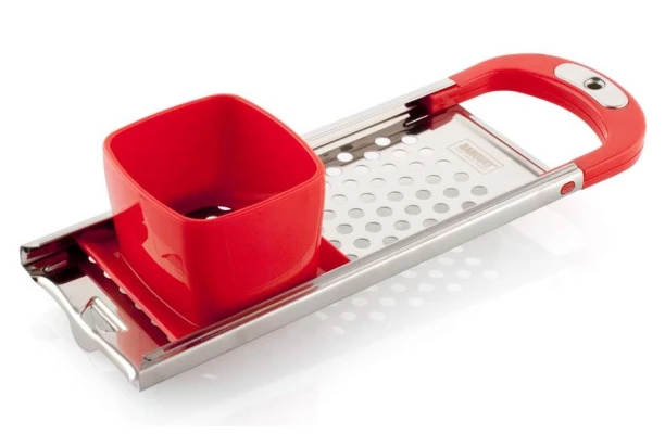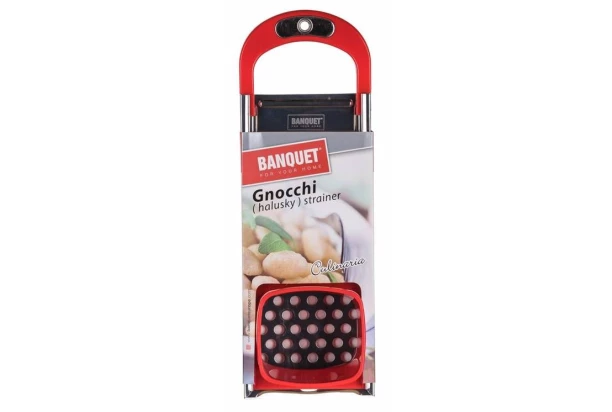 Nerezové strúhadlo s plastovým držadlom a jazdcom na cesto v červenej farbe je skvelá kuchynská pomôcka na výrobu rovnomerných nokov zo zemiakového cesta. Pripravte domáce halušky ľahko a rýchlo. Dĺžka 32 cm.
