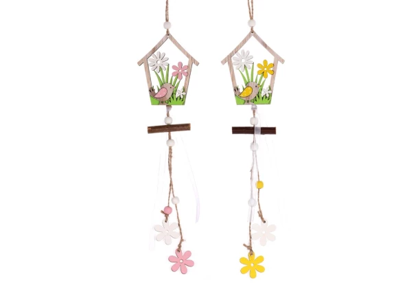 Dekoratívna vtáčia búdka na zavesenie s vtáčikom a kvetmi v ružovej alebo žltej farbe je skvelou ozdobou Veľkej noci a jari.