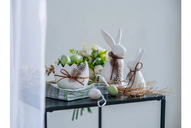 12-dielna sada veľkonočných vajíčok na zavesenie sa stane krásnou dekoráciou a navodí tú správnu sviatočnú atmosféru. Biele a zelené plastové vajíčka sú zlato zdobené.