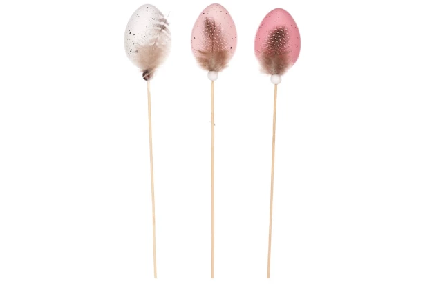 Dekoračný zápich (6 ks) pomôže dotvoriť veľkonočnú atmosféru. Plastové vajíčka s pierkom sú vo farbe biela a ružová.