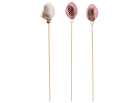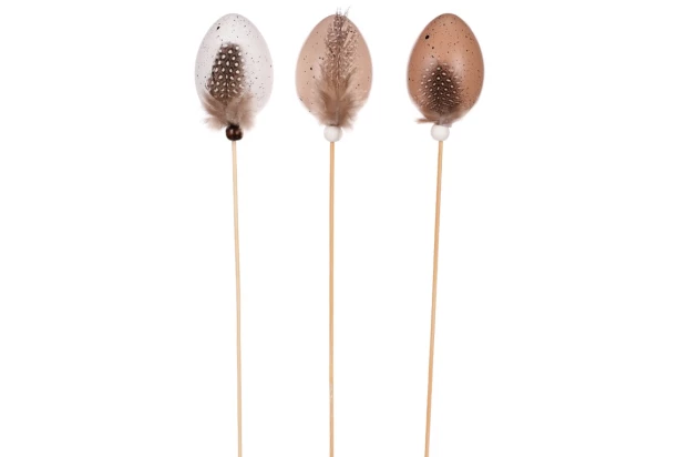 Dekoračný zápich (6 ks) pomôže dotvoriť veľkonočnú atmosféru. Plastové vajíčka s pierkom sú vo farbe biela a hnedá.
