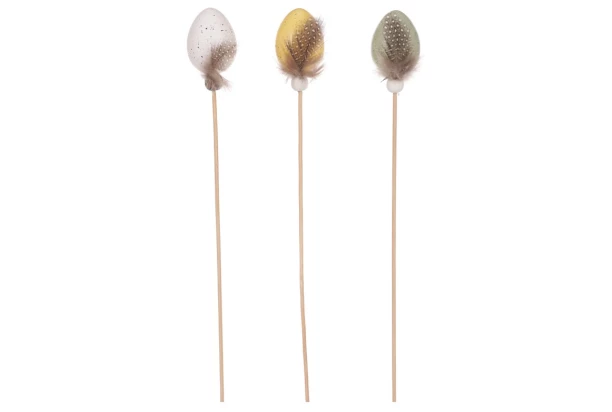 Dekoračný zápich (6 ks) pomôže dotvoriť veľkonočnú atmosféru. Plastové vajíčka s pierkom sú vo farbe žltá, biela a zelená.