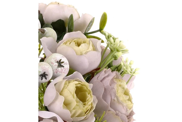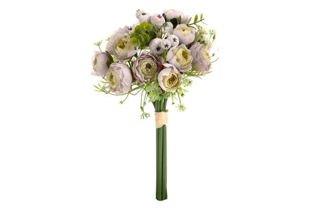 Krásne aranžovaná umelá kytica imituje iskerníkov v krémovej farbe. Iskerníky čiže ranunkulusy v pugete vyzerajú elegantne a ozdobia každý domov.