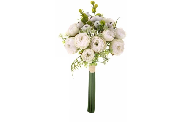 Krásne aranžovaná umelá kytica imituje iskerníkov v bielej farbe. Iskerníky čiže ranunkulusy v pugete vyzerajú elegantne a ozdobia každý domov.